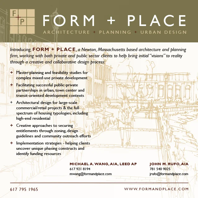 After twenty + years of architectural design and planning I’ve launched my own practice with Michael Wang. Michael and I have been working together for the last fifteen years at Arrowstreet in Somerville, Massachusetts. As the economy begins to come around, we think the best time for successfully creating our own design studio is now. We’d like to extend our gratitude to the people of Arrowstreet past and present. We will be finishing project work there over the next few months, and with a spirit of mutual appreciation, will continue to look for ways to collaborate. 2012 ought to be an interesting year. Look for more info here on my blog and at our website: www.formandplace.com