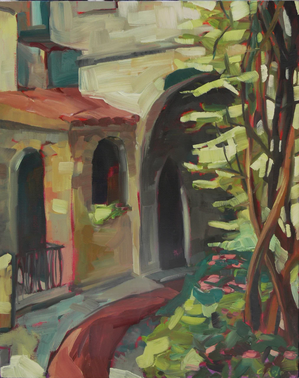 This is the first of two paintings I just finished. They were commissioned by a Needham family who had taken a fabulous trip in Europe and wanted to remember it in a special way. The original photos didn’t have a lot of contrast, and there were people on the path but we decided to skip the people (since they weren’t so picturesque) and increase the sense of light.