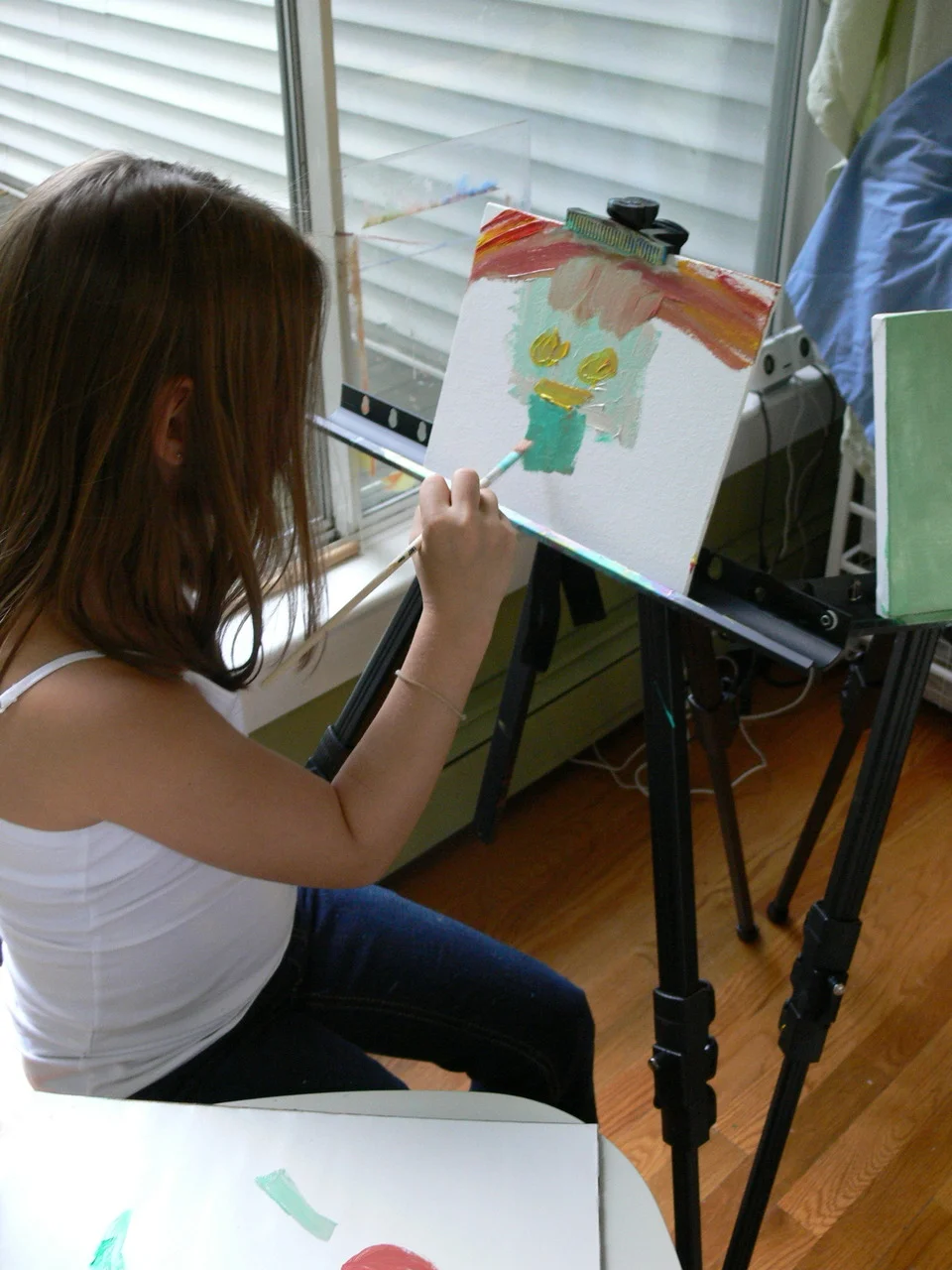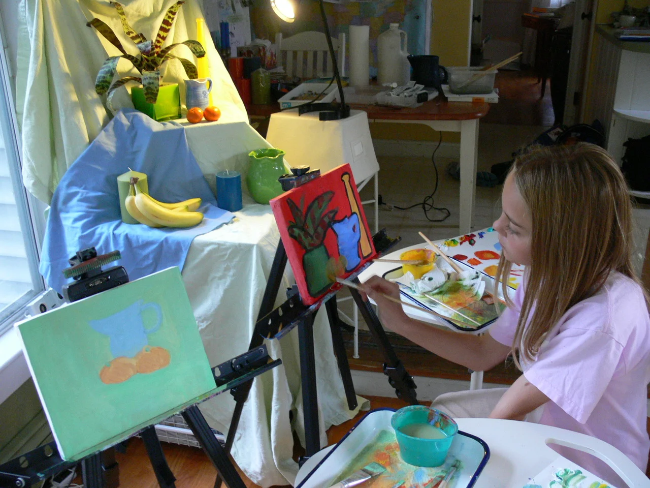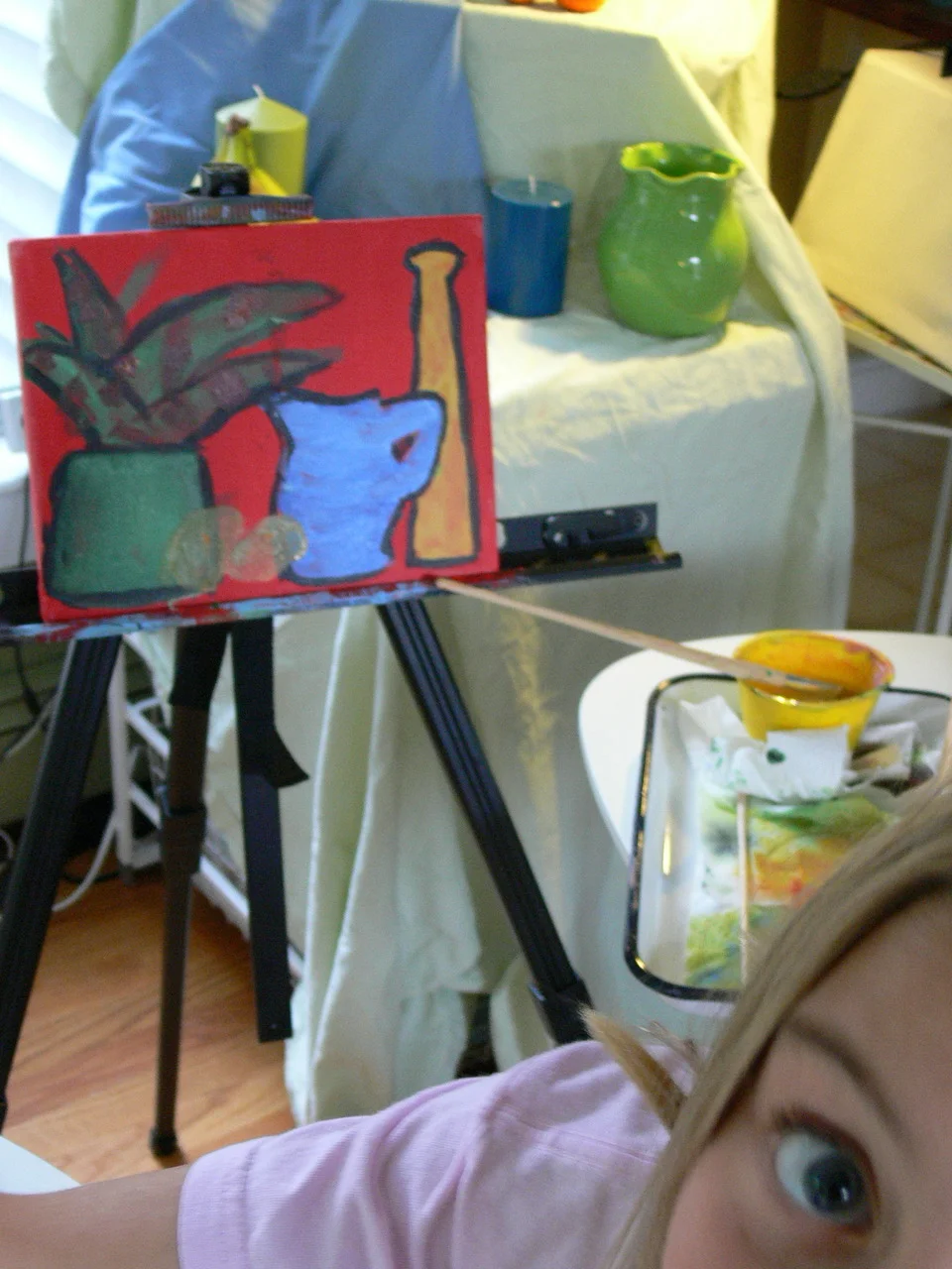 These kids are really fantastic! They jumped right into working on an easel, with real canvases, long brushes, and a variety of other details that were new to most of them. We covered still life painting, portraits and a bit of abstract painting.