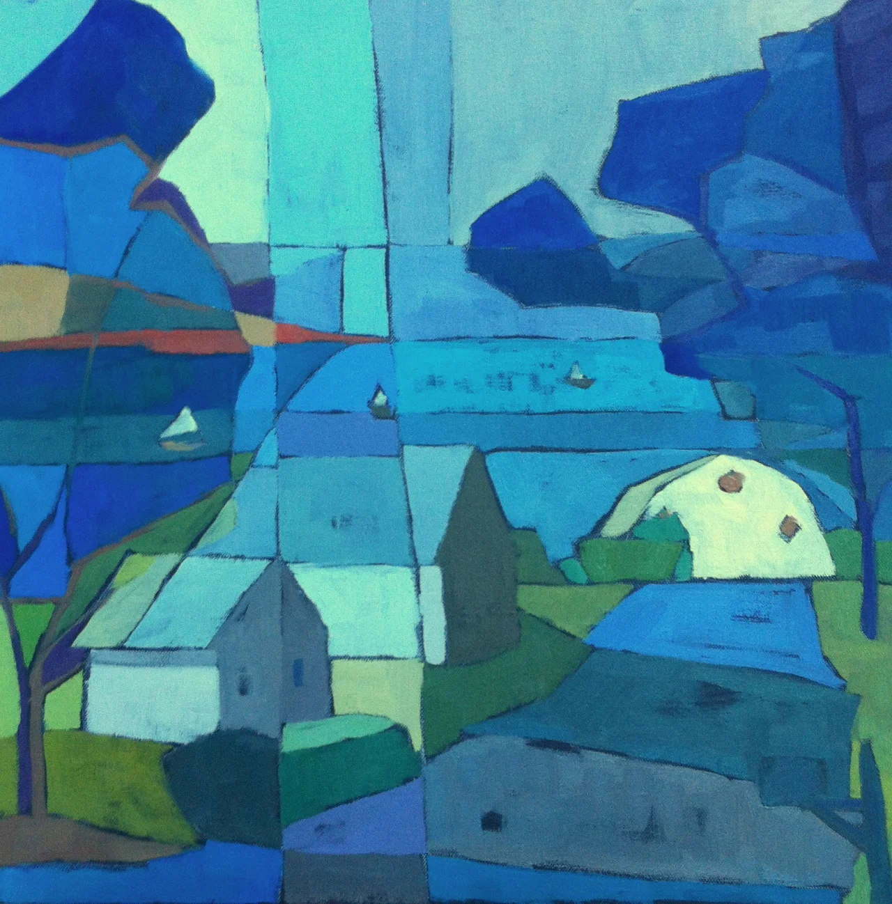 "Wellfleet Cottages and Boats" 18" x 18" oil on canvas. I did several smaller paintings of this before I was able to abstract the scene the way I wanted to. October 4, 2012