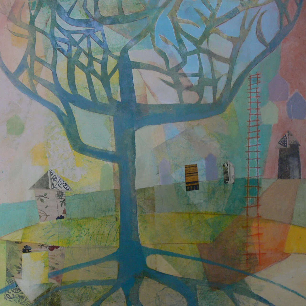 Mixed media and oil paint on board. 12” x 12”